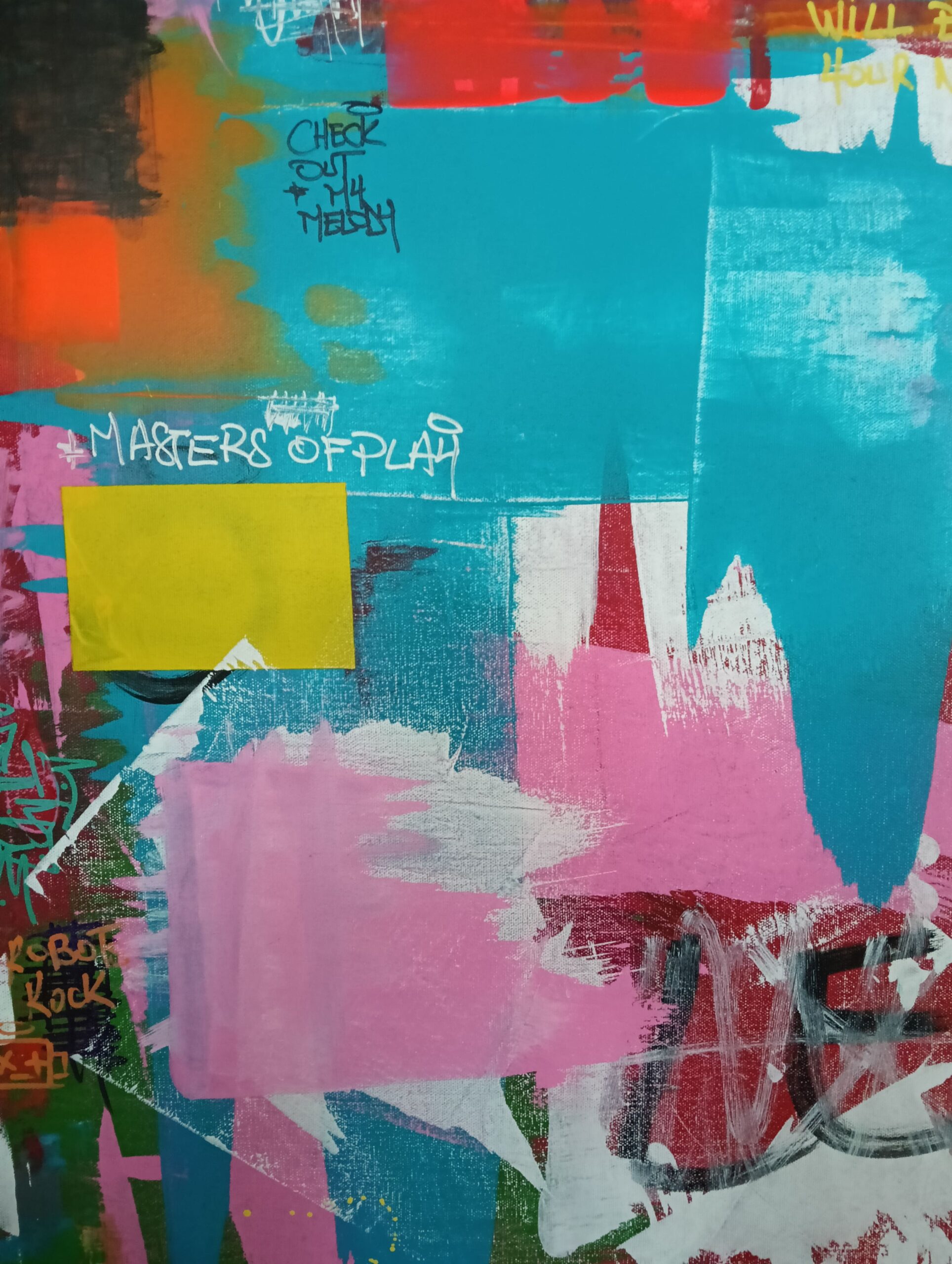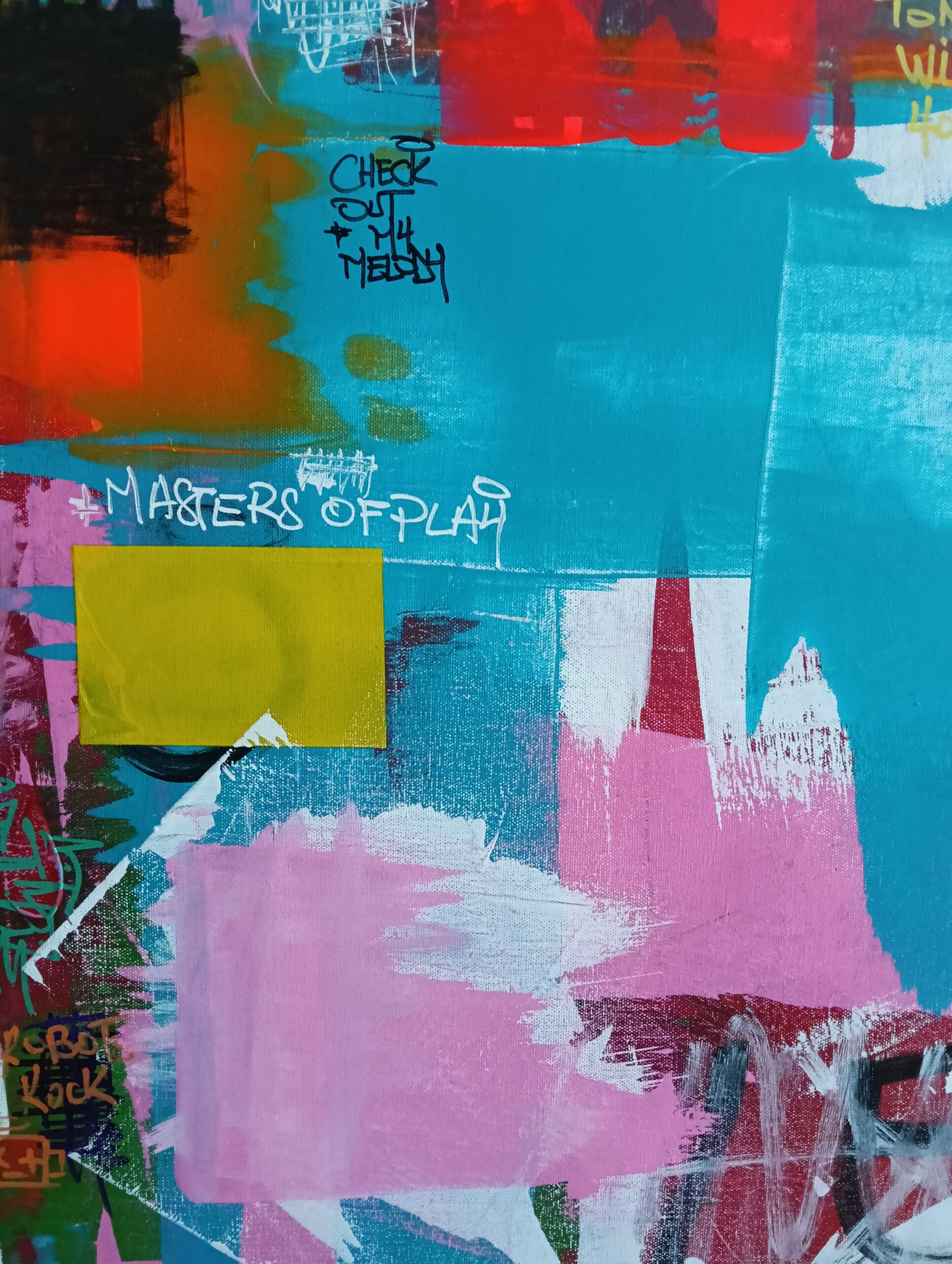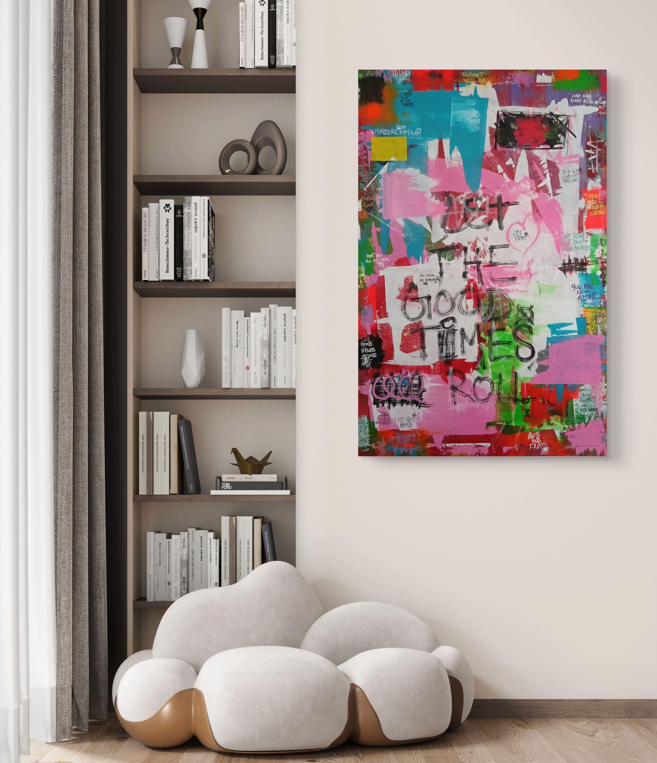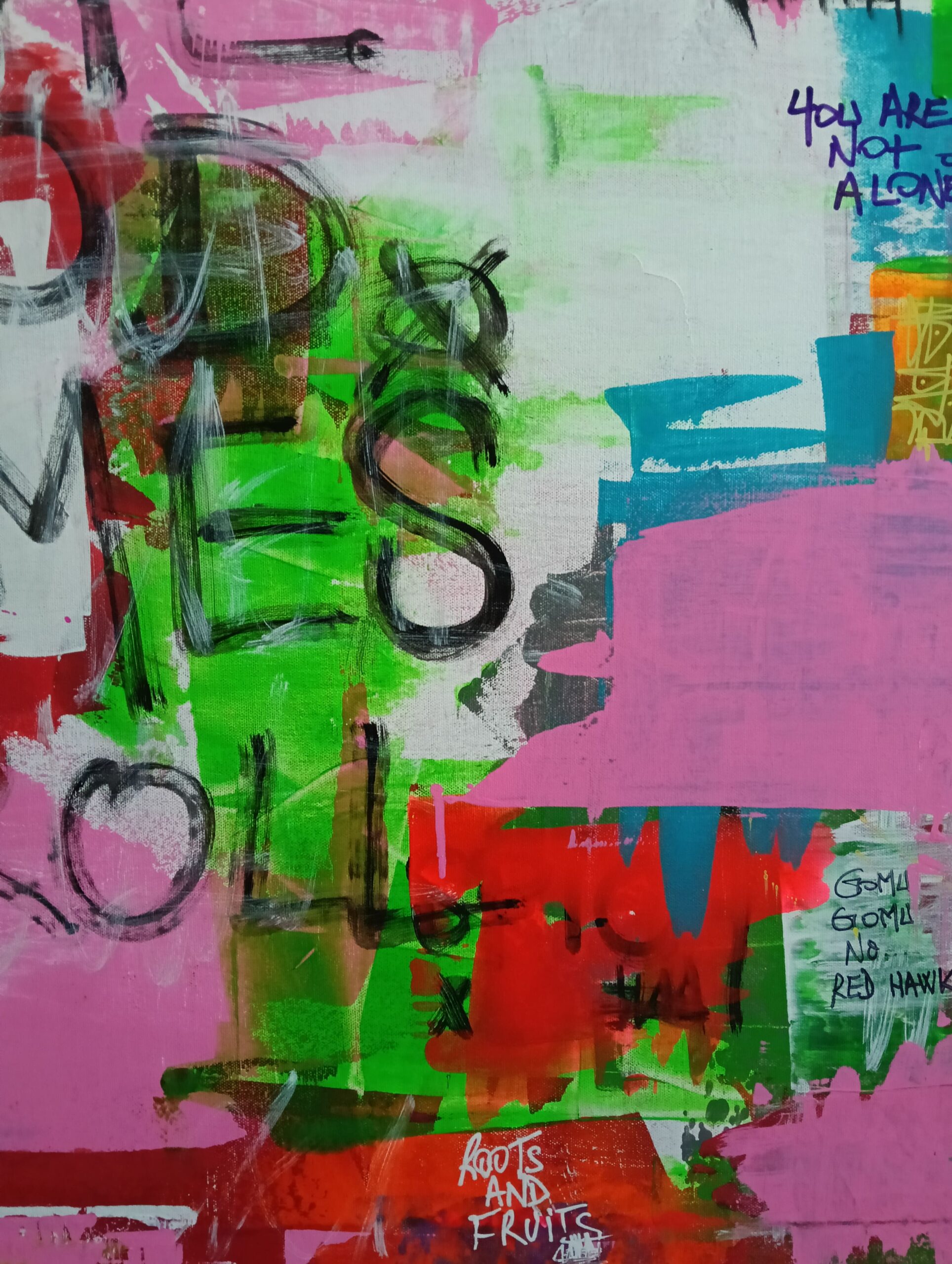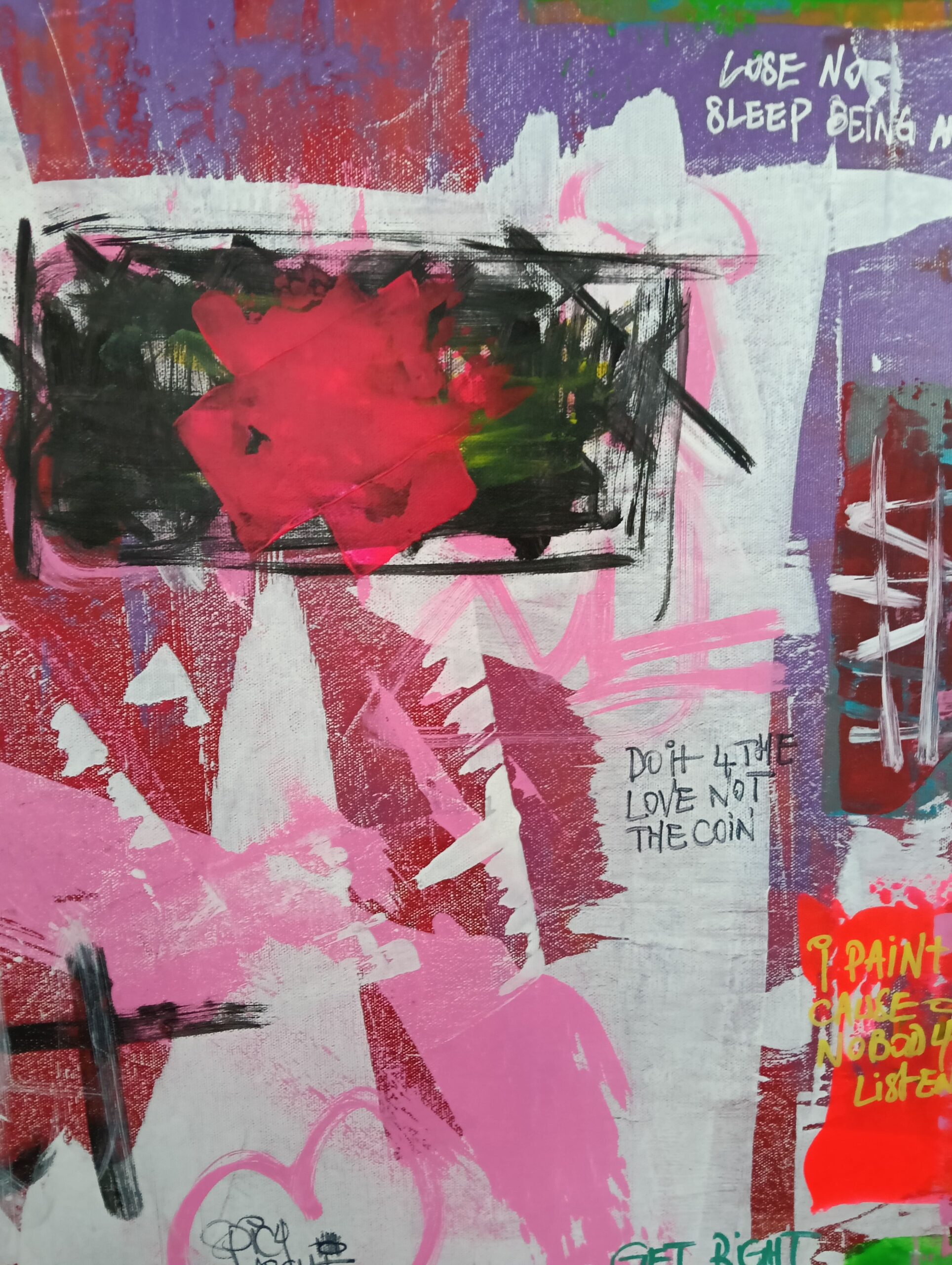 “Let the Good Times Roll” bursts with raw energy, vibrant colors, and an unapologetic invitation to celebrate life. This street art piece is a visual party on canvas, blending chaotic layers of pinks, greens, reds, and blues, with rebellious scribbles and thought-provoking messages scattered throughout. It’s a playful clash of freedom and expression, a carnival of texture and meaning that feels as alive as the moments it inspires.