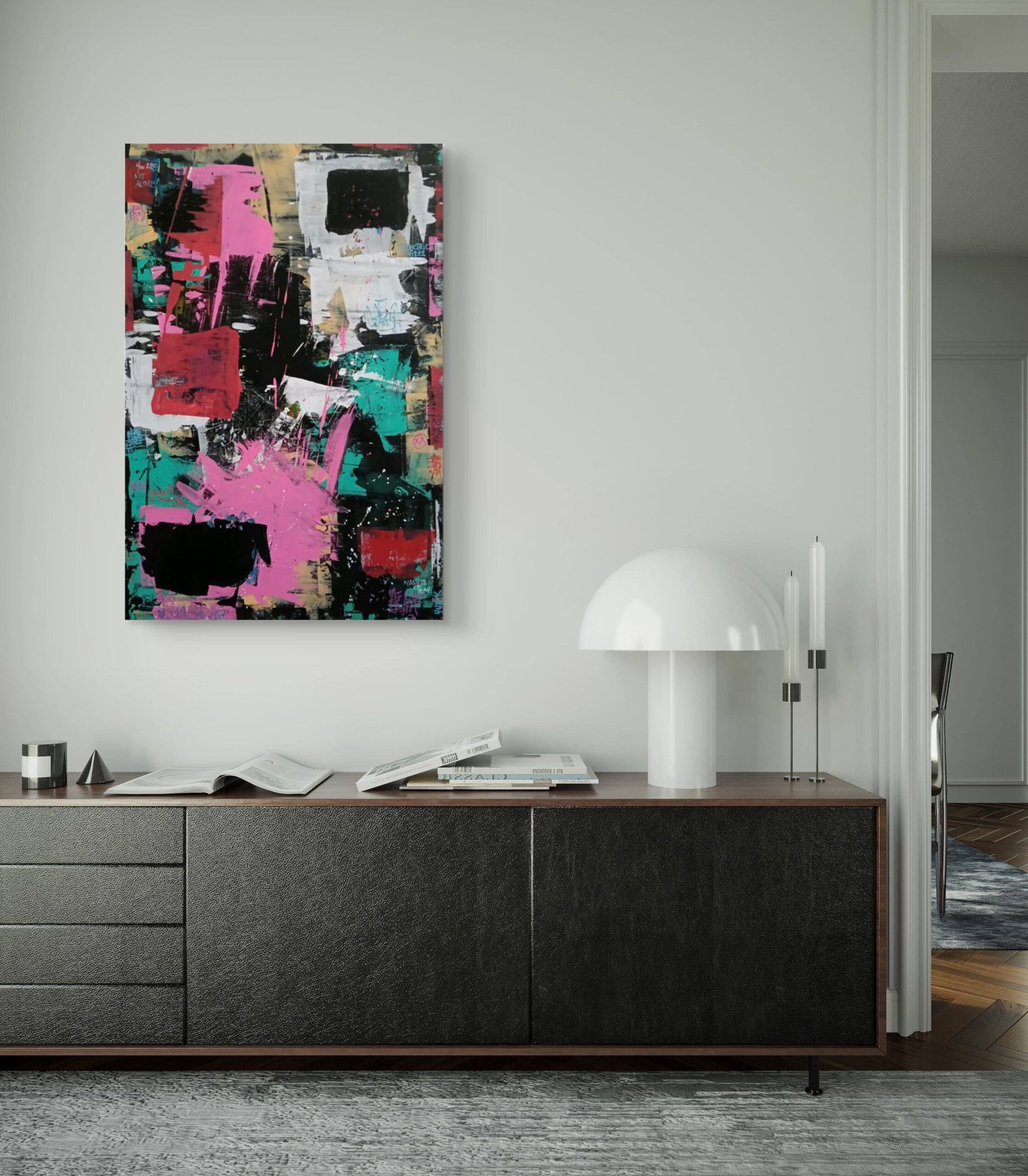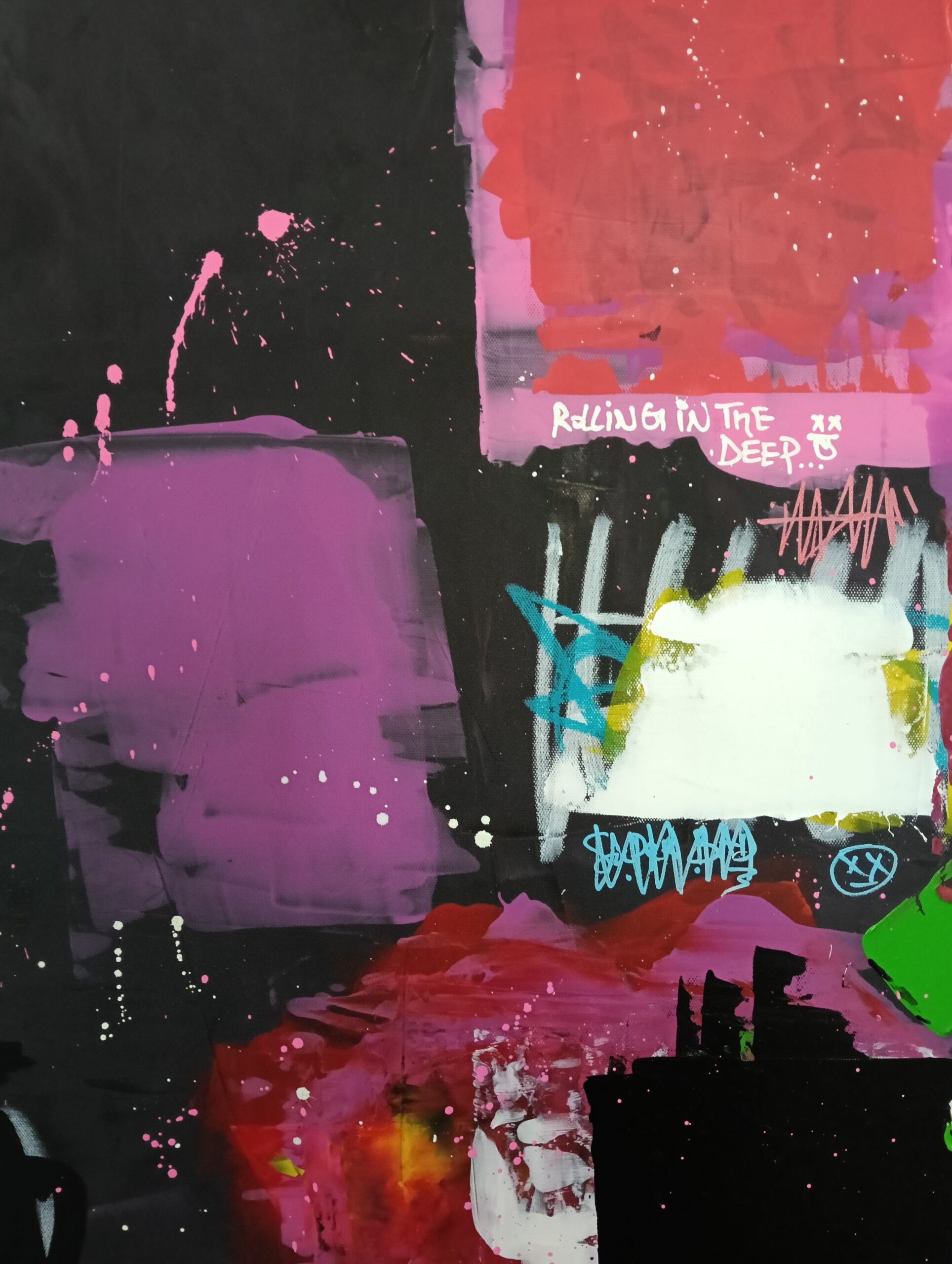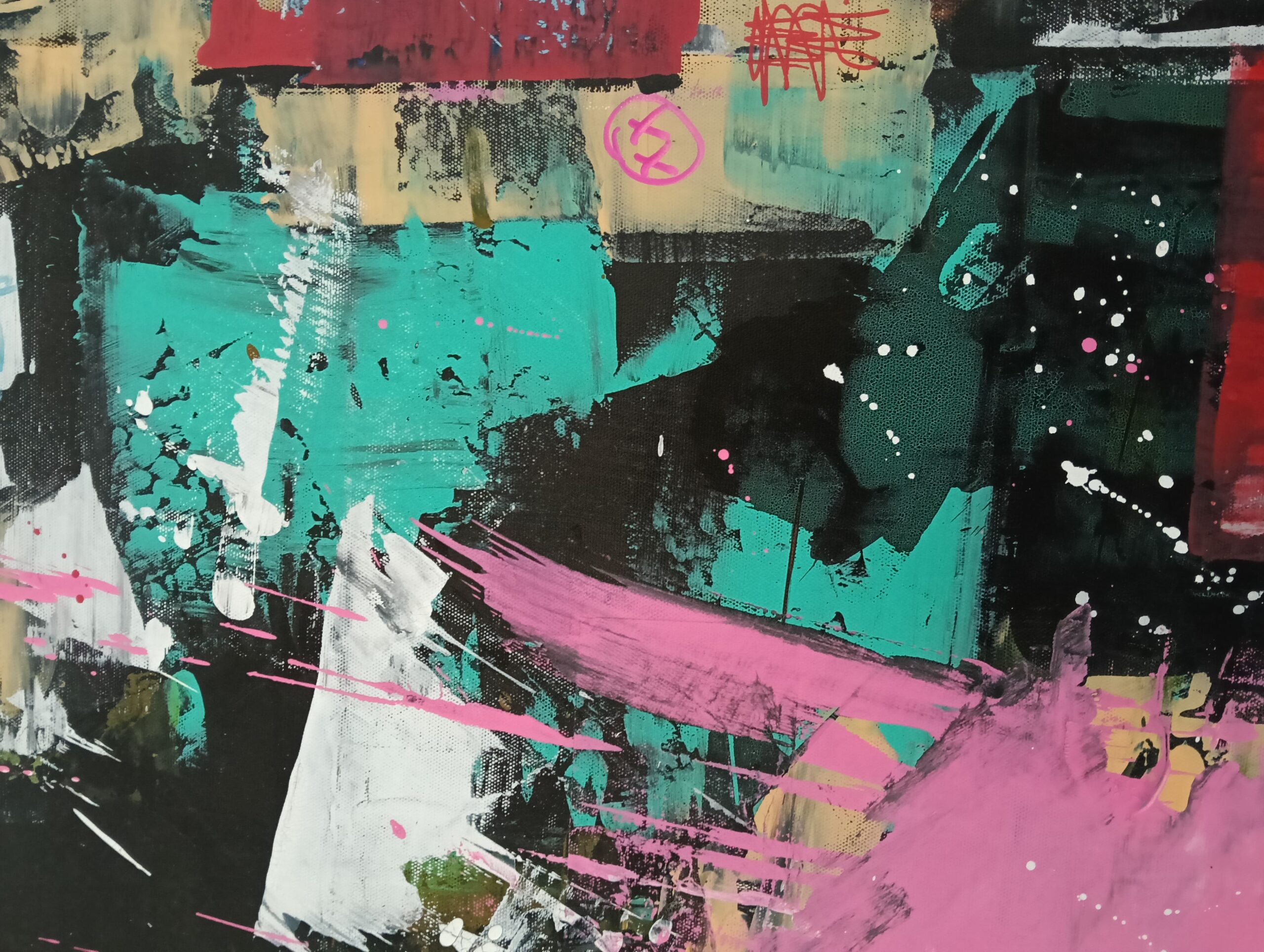 “The Mixtape Vol.2”- is a bold, energetic abstract painting that encapsulates the pulse of urban life and the raw essence of street art. The composition is marked by splashes of vibrant pink, deep reds, turquoise, and black and white, creating a layered and textured visual experience. The irregular, overlapping shapes and patches of color feel spontaneous, as if they were painted in the midst of a lively, bustling city where walls are canvases for expression.